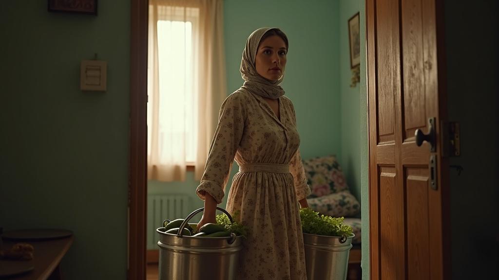 Оксана в этот раз вышла не просто с одним ведром — а сразу с двумя. В одной руке у неё огурцы, в другой — кабачки, а на голове — платок, повязанный так, что уши торчат наружу. На лице читается выражение: «подойди — пожалеешь». Но к забору уже тянется Любовь, словно подсолнух к солнцу, только вместо семечек у неё — просьбы.