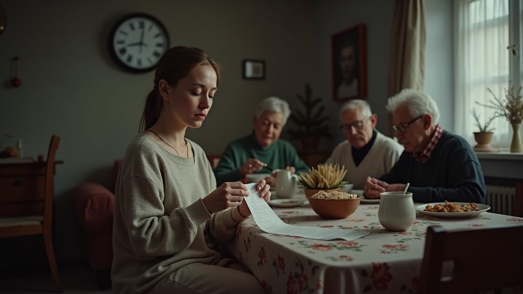 Третье января выдалось хмурым и пронизывающе холодным. Новогодние украшения, еще недавно казавшиеся сказочными, теперь выглядели как пестрое напоминание о пустом кошельке. Оксана сидела на кухне у свекрови, Галины, и нервно теребила в пальцах длинный чек из супермаркета — тот тянулся почти как зимняя ночь.