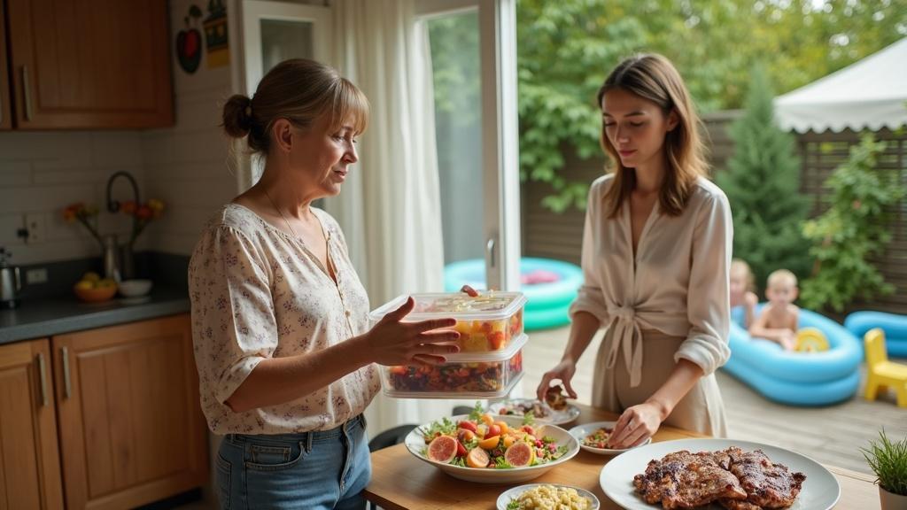 Себе тоже оставила немного барбекю — чтобы не стоять у плиты на следующий день. Мы не планировали ночевать на даче: вечером собирались возвращаться домой. Поэтому всё упаковала заблаговременно: два контейнера с мясом и один с салатом. Подписала аккуратно и отставила в сторону.