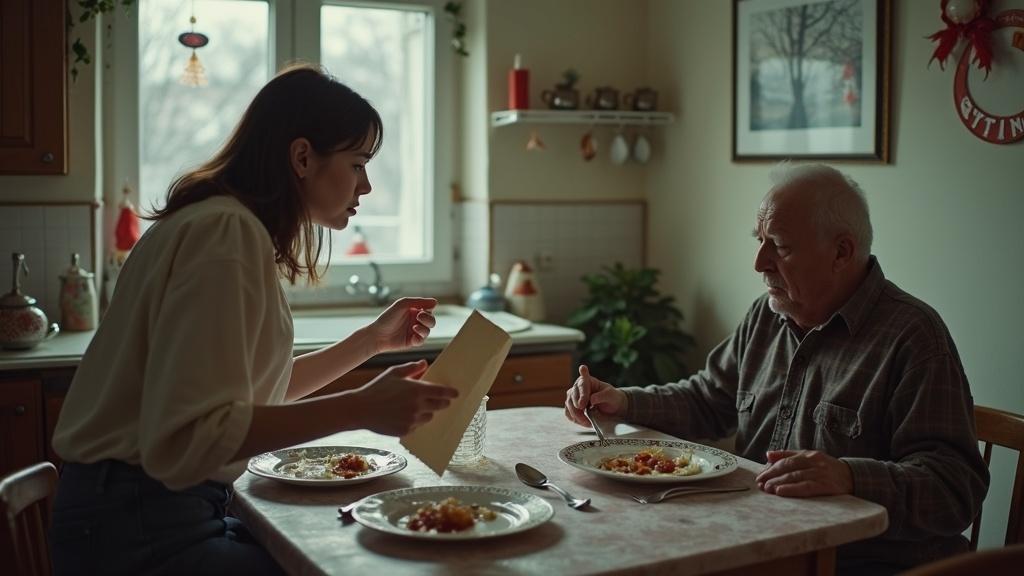 Алексей, сидевший над тарелкой вчерашнего супа в своей привычной выцветшей фланелевой рубашке, даже не шелохнулся. Он неспешно отложил ложку, промокнул губы бумажной салфеткой и только после этого поднял глаза на жену.
