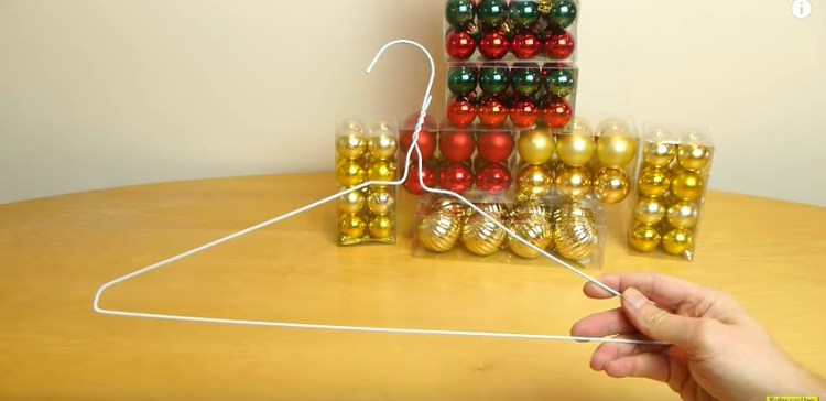Хитрость этого праздничного трюка в том, что нужно раскрутить в верхней части вешалку, выгнуть проволоку и сделать окружность. Надеть украшения на нее и снова скрепить.