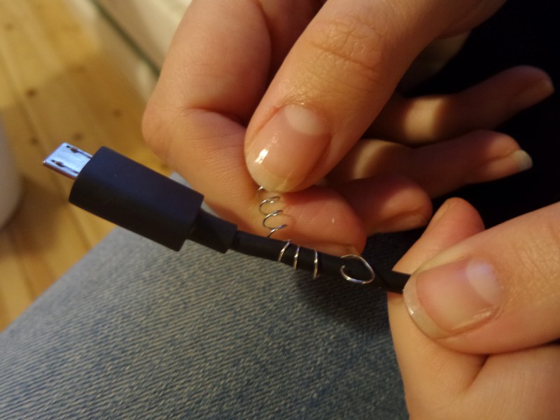 Оберните пружиной от старой ручки-автомата конец зарядного кабеля смартфона, чтобы стабилизировать его. Это позволит предотвратить взлом.
