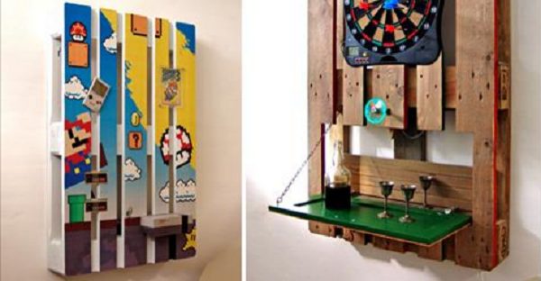 Тут объединены различные полезные и бытовые Нужные вещи, такие как лампы, стерео система, зарядные устройства, усилители, колонки, часы и т.д. Используя обыкновенные деревянные поддоны можно сделать эти многофункциональные, тематические украшения.