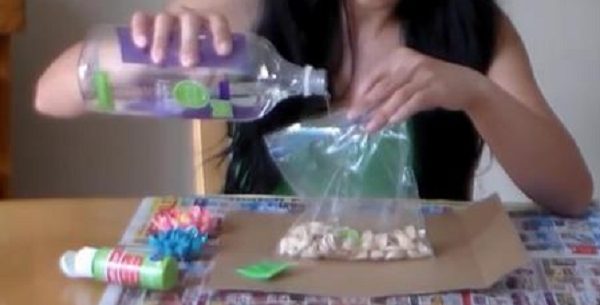Поместите фисташковую скорлупу в хорошо запечатанный пакет. Положите акриловую краску и столовую ложку воды в мешок.