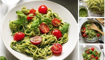 Спагетти из цуккини с песто и томатами черри
